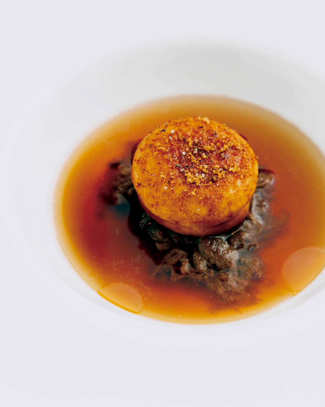 蝦夷鹿の旨みを凝縮した澄んだコンソメに、海老のクネルを浮かべました。