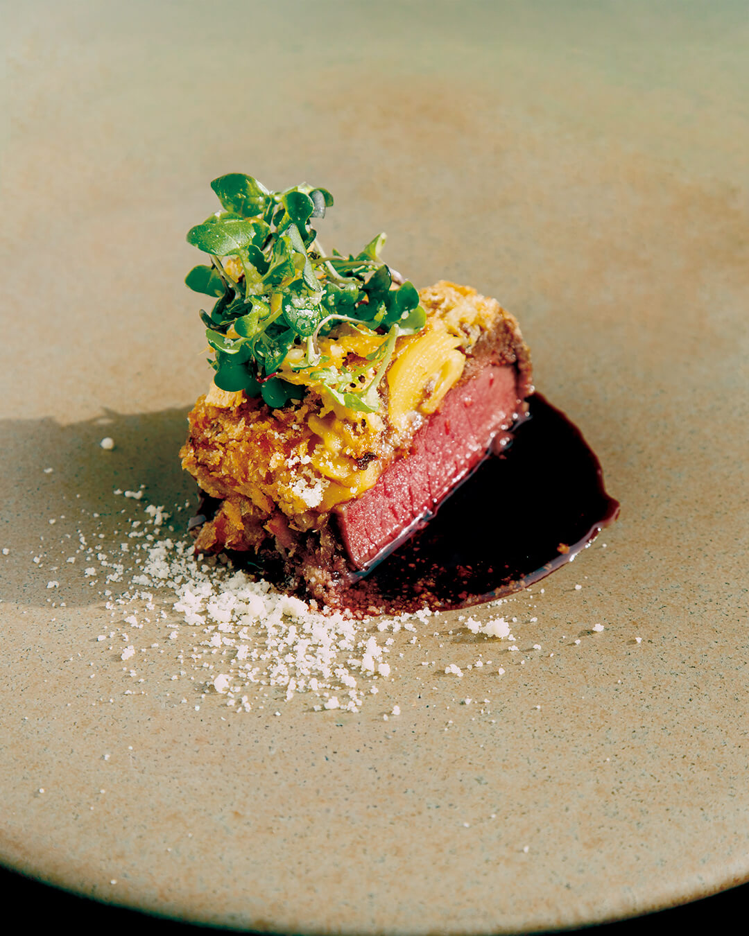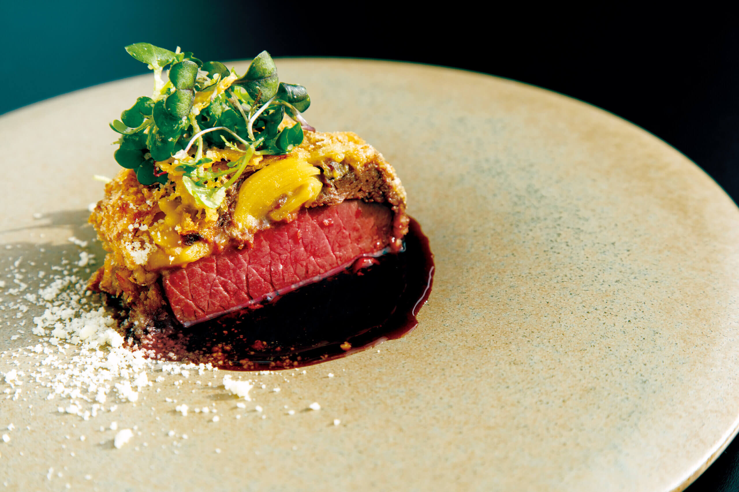 蝦夷鹿肉の周りに鹿肉のパルマンティエをまとわせ、パン粉焼きにしました。